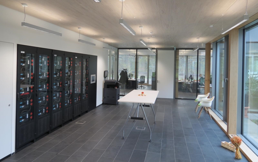 Da der überschüssige Strom in große Batteriespeicher zwischengespeichert wird, kann die Halle inklusive der Produktion auch an trüben Tagen zu einem großen Teil mit eigenerzeugtem Solarstrom versorgt werden. Die jährliche Eigenerzeugung ist höher als der Stromverbrauch für das Gebäude und die Produktion.