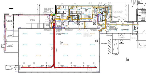 Der energetischen Optimierung dient eine raumlufttechnische Anlage mit Wärme- und Feuchterückgewinnung über einen Rotationswärmetauscher. Die Frischluft wird im Hallenbereich eingespült und im Bereich der Umkleiden, Duschen und WC’s wieder abgesaugt. Durch diese Art der Luftführung (Doppelnutzung) werden sowohl die Investitions- als auch die Betriebskosten deutlich minimiert.