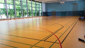 Bei der Wärmeverteilung konnte die ursprünglich angedachte Deckenstrahlheizung inkl. integrierter ballwurfsicherer LED-Beleuchtung für den Hallenbereich aus Gründen der Dachstatik nicht verwirklicht werden. Da der vorhandene Schwingboden abgängig war, wurde eine Schwingbodenheizung (FBH) eingesetzt. Auch der angeschlossene Umkleide- und Duschbereich wurde komplett saniert und mit einer Fuß-bodenheizung versehen.